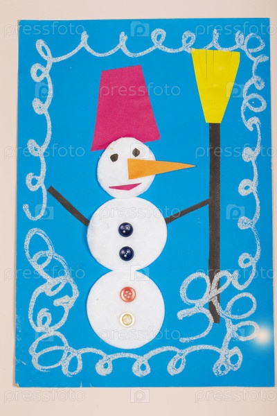 Детские новогодние поделки из бумаги. Применение детского творчества. Детский сад и школа ремесел. На бежевом фоне снеговик из цветной бумаги