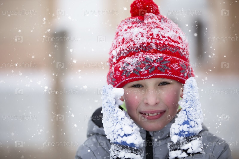 Ребенок зимой. Маленький мальчик в теплой шапке и варежках смотрит в камеру и улыбается
