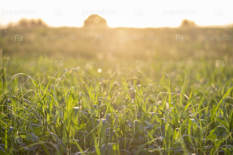 Зеленая трава на поле, освещенном солнцем. Экологический фон