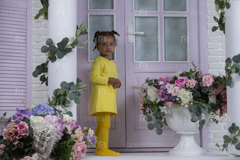 Маленькая африканская девочка в желтом платье стоит на крыльце дома с цветами