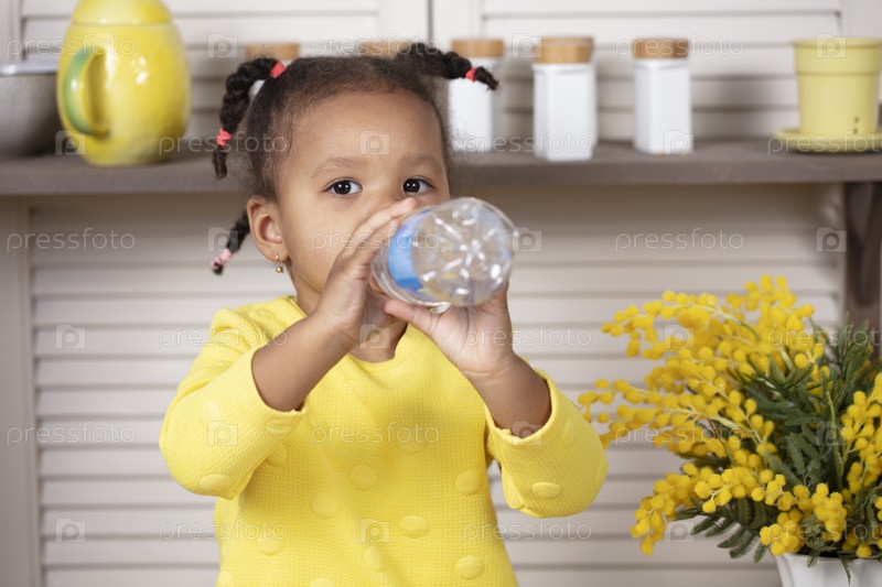 Маленькая африканская девочка пьет воду из пластиковой бутылки
