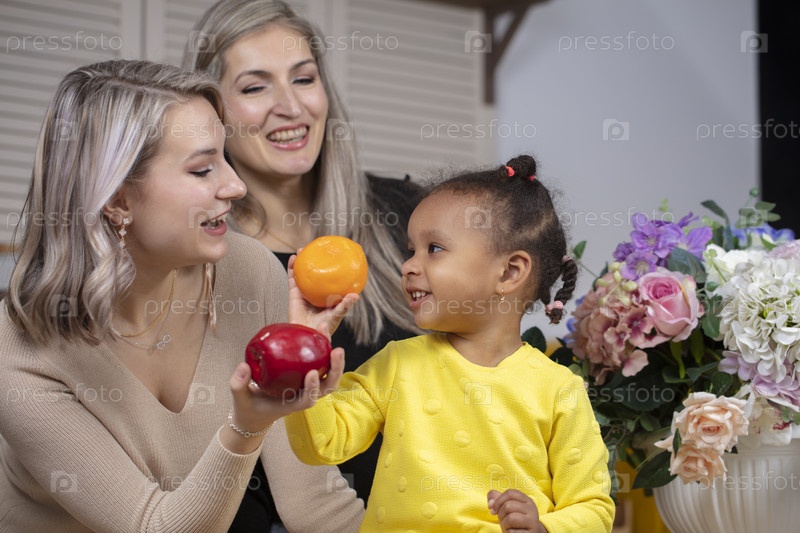 Семья из разных рас. Мама, светлокожая бабушка и маленькая афроамериканка играют на кухне