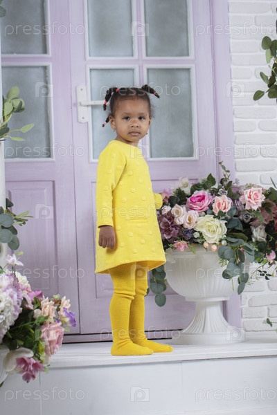 Маленькая африканская девочка в желтом платье стоит на крыльце дома с цветами