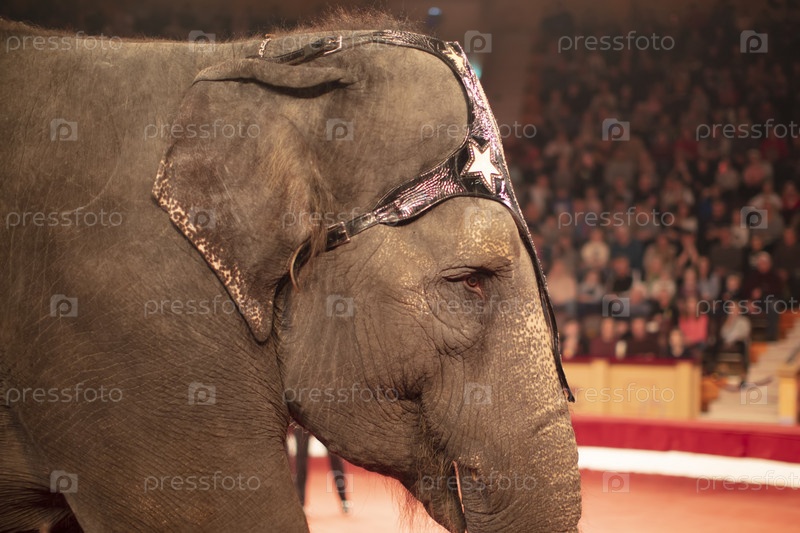 Часть морды циркового слона на фоне размытых зрителей. Животные в цирке