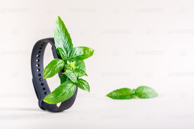 Свежие листья на экране фитнес-браслета. Концепция здравоохранения, жизнеспособность