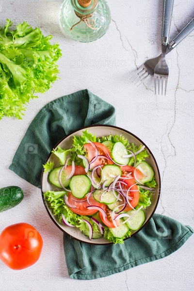 Помидор, огурец, лук, салат на тарелке. Вегетарианская пища. Верхний и вертикальный вид