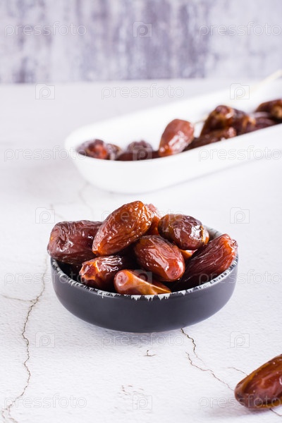 Спелые сушеные финики в миске на столе. Восточный десерт. Вертикальный вид