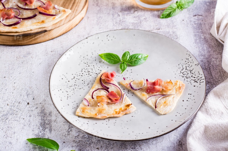 Ломтики французского тарт фламмкухен с беконом, сливочным сыром и луком на тарелке