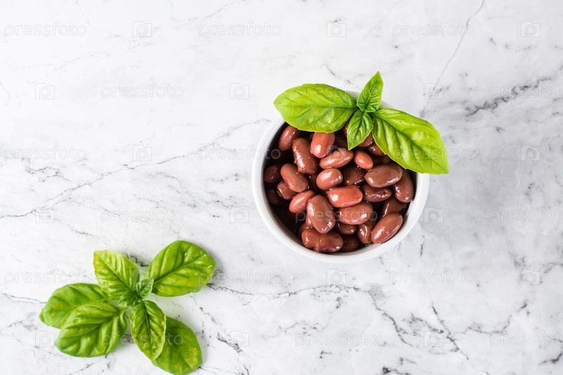 Вареная красная фасоль в миске и листья базилика. Альтернатива мясному белку. Вид сверху
