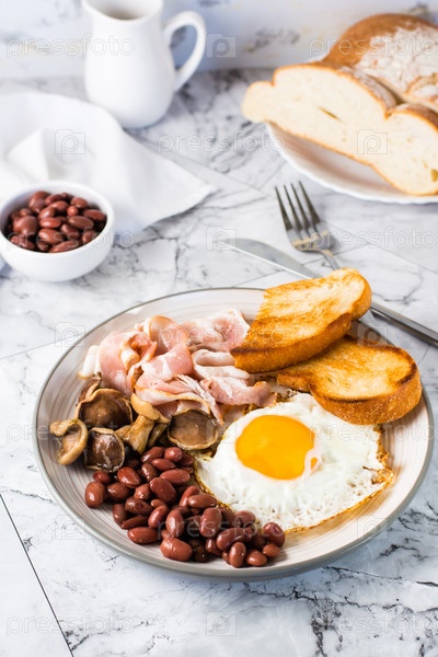 Английский завтрак с жареным яйцом, беконом, фасолью, грибами и тостами на тарелке. Вертикальный вид
