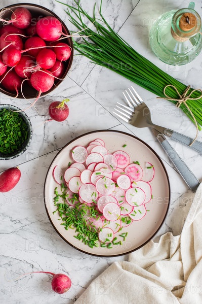 Салат из свежей редьки и зеленого лука на тарелке на столе. Домашняя еда. Вид сверху и вертикальный