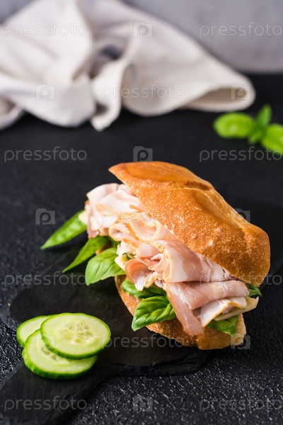 Готовый бутерброд с беконом, огурцом, сыром и базиликом. Домашний фаст-фуд. Вертикальный вид