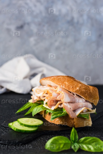 Аппетитный бутерброд с пастрами, огурцом, сыром и базиликом. Домашний фаст-фуд. Вертикальный вид