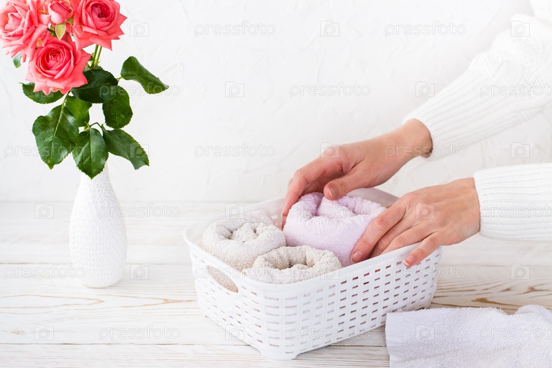 Женские руки аккуратно складывают полотенца в корзину. Организация и порядок