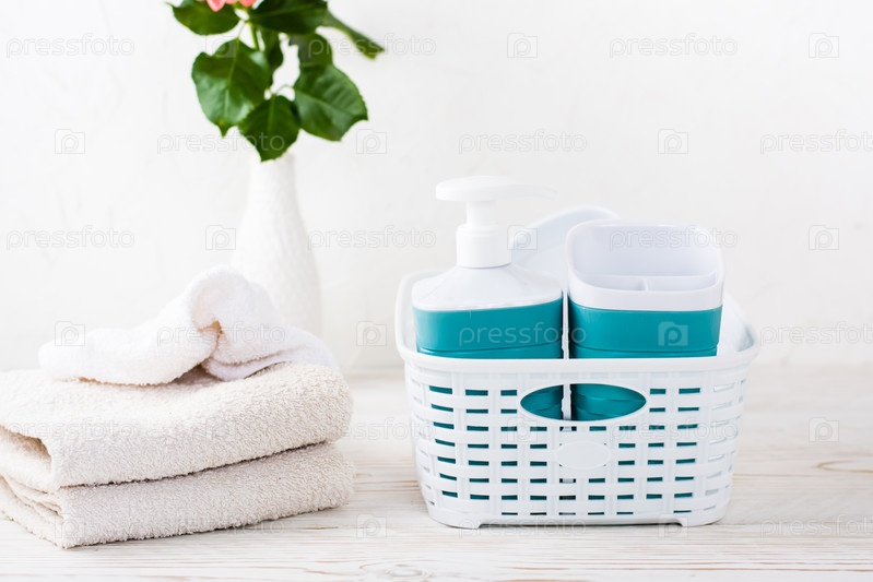 Аксессуары для ванной комнаты в корзине и стопка полотенец на столе. Организация и порядок