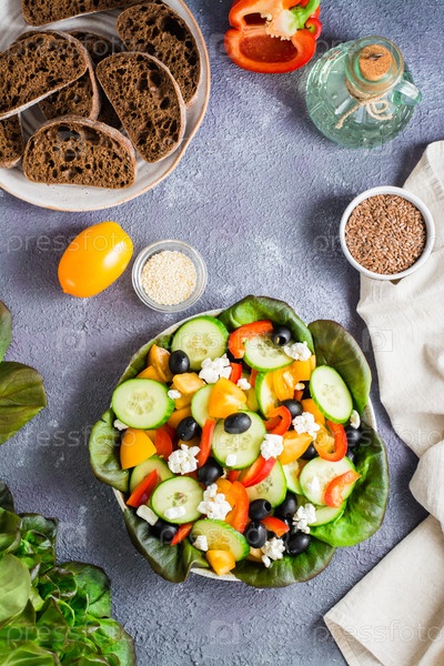 Греческий салат из свежих овощей, листьев и сыра фета на тарелке. Вид сверху и вертикальный