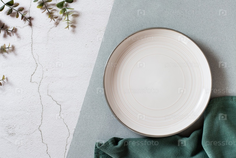 Пустая керамическая тарелка, ветки эвкалипта и ткань на двухцветном фоне. Эко концепция. Вид сверху