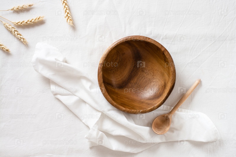 Пустая деревянная миска, ложка и ухо на ткани. Вид сверху. Экологичная концепция