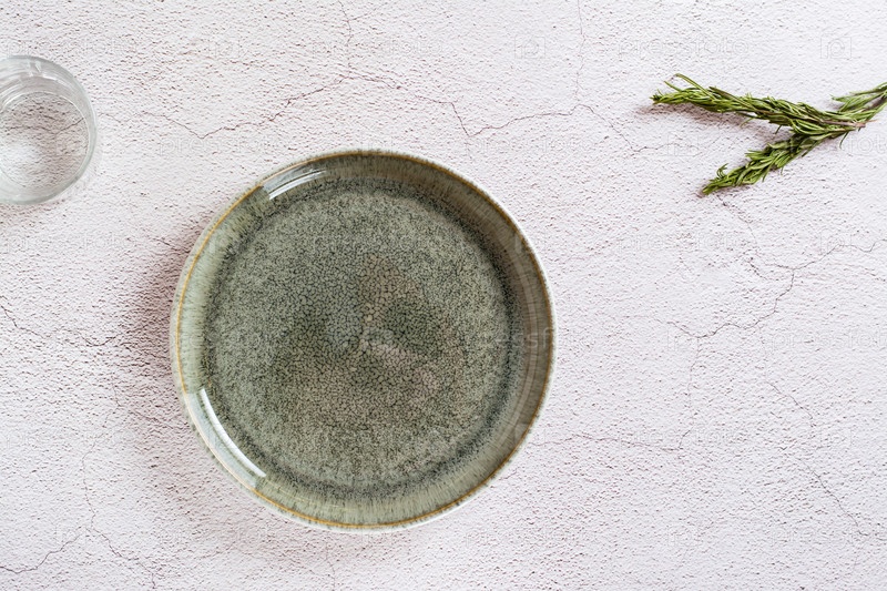 Пустая керамическая зеленая тарелка, стакан воды и ветки розмарина на сером фоне. Вид сверху