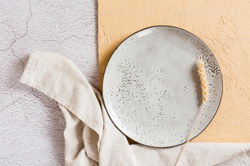Ухо лежит в пустой керамической тарелке на текстурированном фоне. Вид сверху. Экологичная концепция
