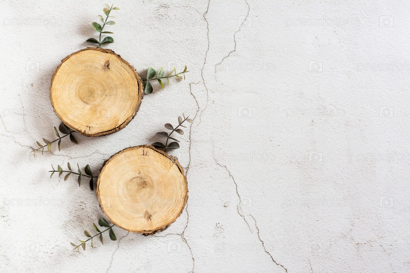 Два пустых среза дерева и ветка эвкалипта на сером фоне. Вид сверху