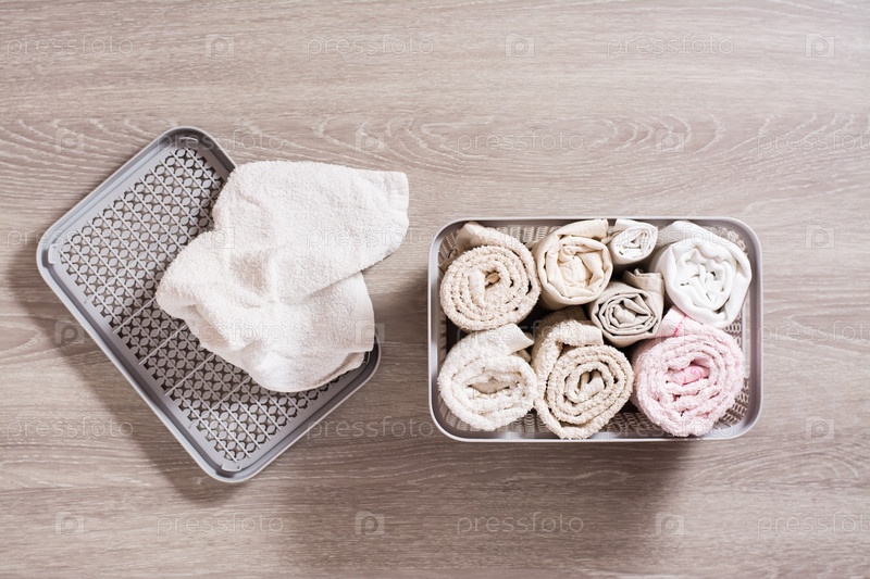 Аккуратно сложенные полотенца в ящике для одежды. Организация и порядок в доме. Вид сверху