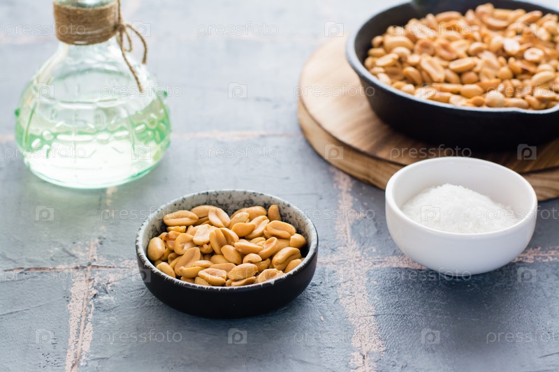 Жареный арахис в миске и на сковороде, миска с солью на столе. Растительный источник белка. Вегетарианская пища