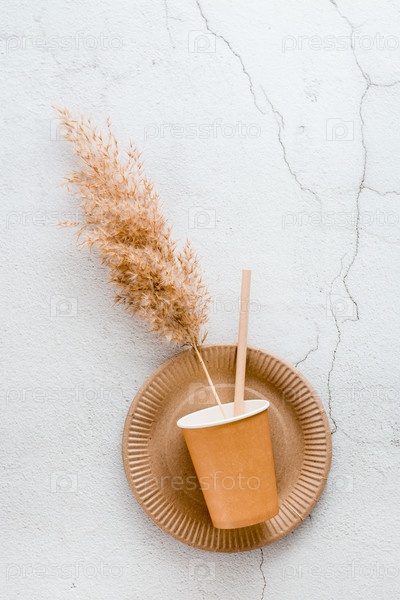 Экологически чистая одноразовая картонная посуда. Чашка и трубка лежат на тарелке на светлом фоне. Вид сверху. Вертикальный вид