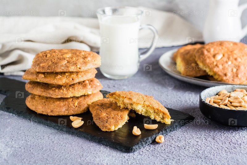 Свежее арахисовое печенье на доске и в тарелке на столе. Домашняя выпечка. Крупный план