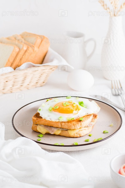 Сэндвич Croque Madam с сыром, беконом и яйцом на тарелке на светлом столе. плотный домашний завтрак. вертикальный вид