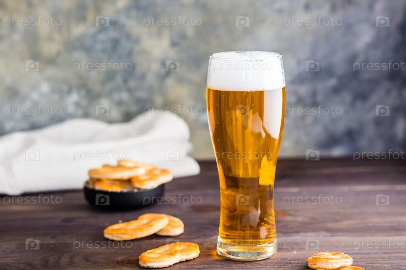 Стакан пива с пеной и солеными кренделями на деревянном столе