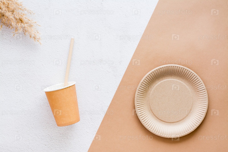 Концепция экологически чистой посуды для еды. Картонная чашка, соломинка для питья, тарелка и початок травы на гипсовом и бежевом фоне. Вид сверху