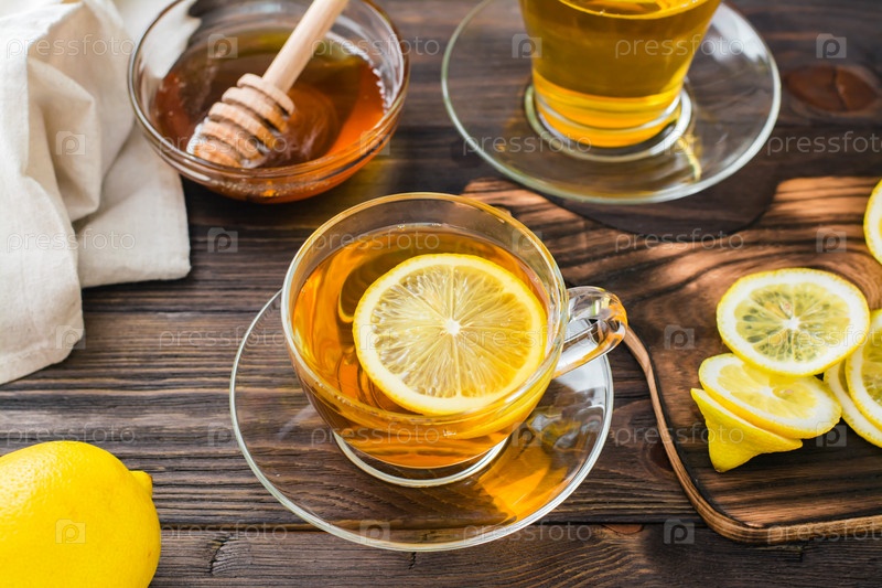 Чашка чая с ломтиком лимона и миску меда на деревянном столе. Витаминный согревающий напиток. Крупный план