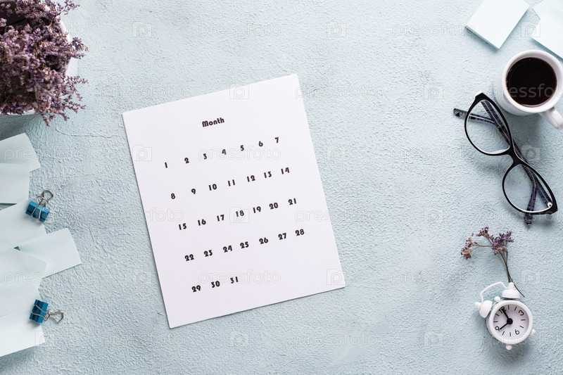 Чистый лист ежемесячного календаря, очки, чашка кофе и будильник на рабочем столе. Планирование и организация времени