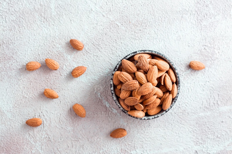 Свежий очищенный миндаль в миске на светлом фоне. Источник витаминов и масел. Органическая еда. Вид сверху