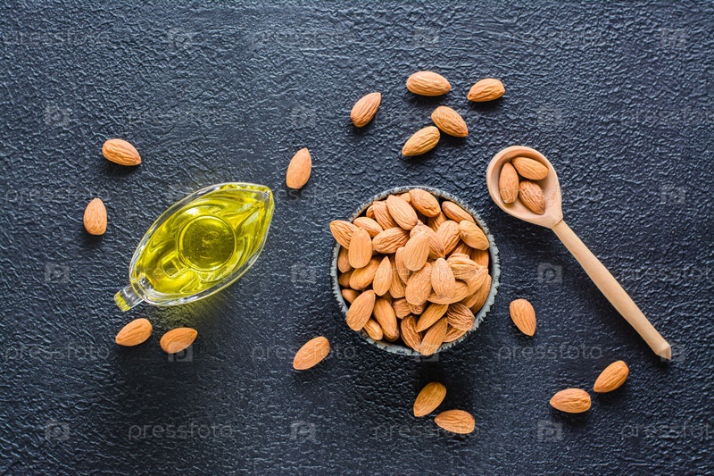Свежий очищенный миндаль в миске и миндальное масло на столе. Источник витаминов и масел. Натуральная косметика. Вид сверху