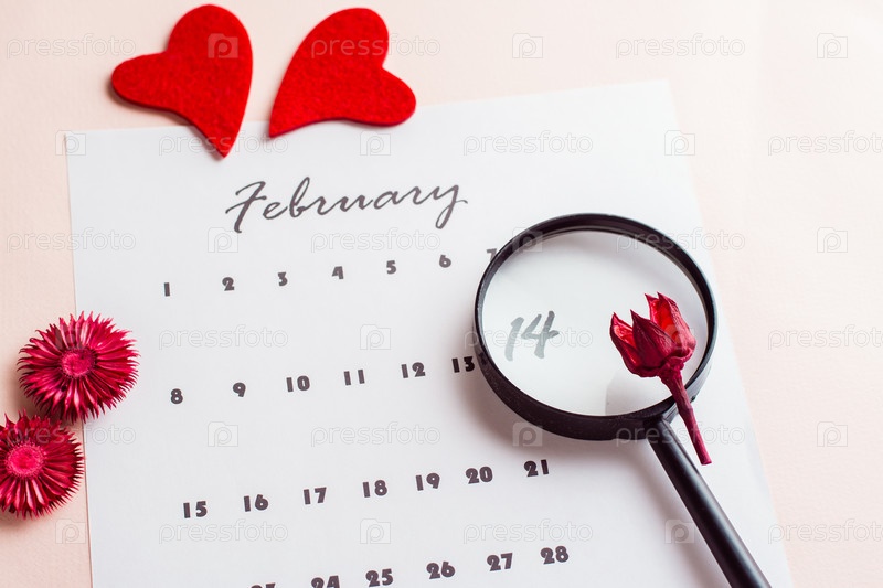 День Святого Валентина. Лупа выделяет дату 14 февраля на листе календаря. Крупный план