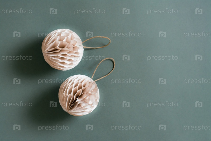 Два рождественских текстурированных сложенных шарика из крафт-бумаги на зеленом фоне. Копировать пространство