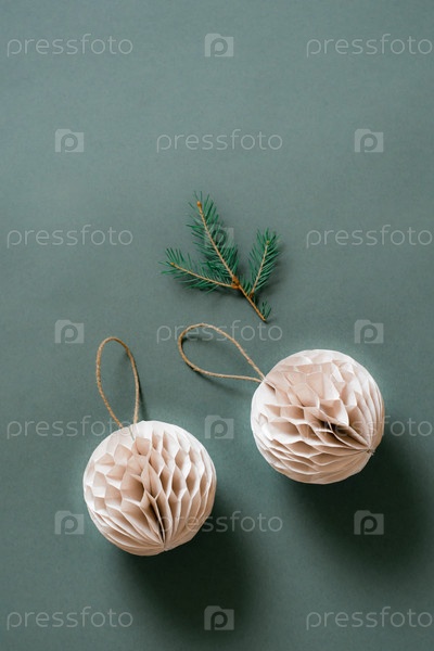Два рождественских текстурированных сложенных шара из крафт-бумаги ветка ели на зеленом фоне. Вертикальный вид