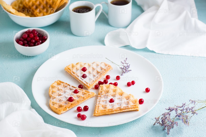 Бельгийские вафли в форме сердца с красными ягодами и сахарной пудрой на тарелке и две чашки кофе на столе. День Святого Валентина