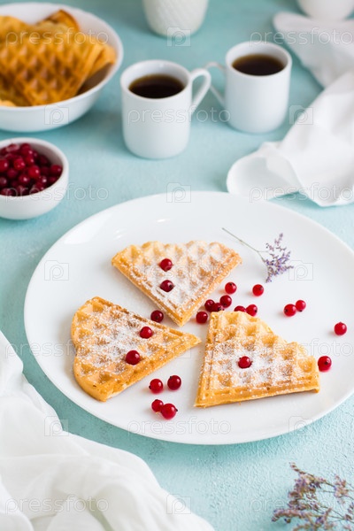 Бельгийские вафли в форме сердца с красной ягодой и сахарной пудрой на тарелке на столе для завтрака. День Святого Валентина. Вертикальный вид