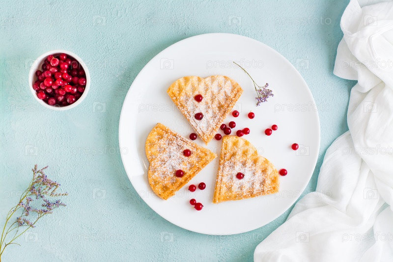 Бельгийские вафли в форме сердца с красными ягодами и сахарной пудрой на тарелке на столе. День Святого Валентина. Вид сверху. Копировать пространство