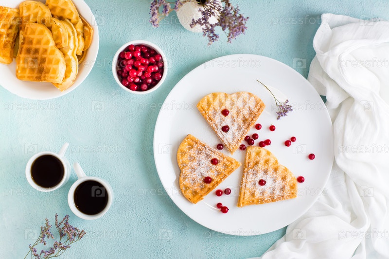 Бельгийские вафли в форме сердца с красными ягодами и сахарной пудрой на тарелке и две чашки кофе на столе. День Святого Валентина. Вид сверху
