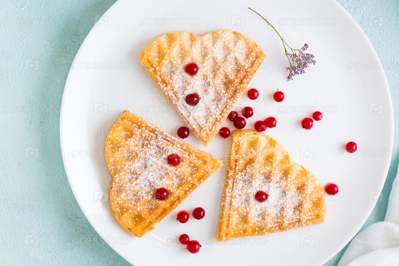 Бельгийские вафли в форме сердца с красными ягодами и сахарной пудрой на тарелке на столе. День Святого Валентина. Вид сверху. Крупный план
