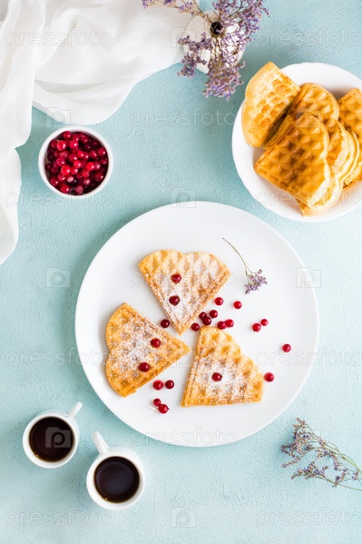 Бельгийские вафли в форме сердца с красной ягодой и сахарной пудрой на тарелке на столе для завтрака. День Святого Валентина. Верхний и вертикальный вид