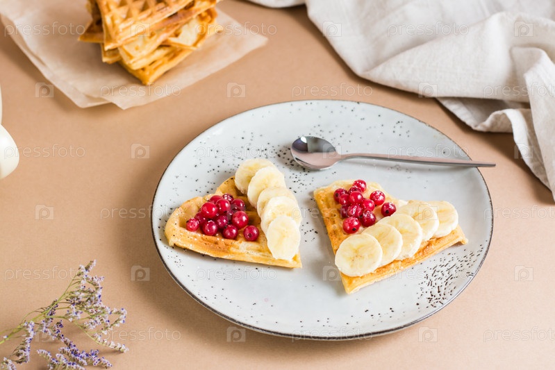 Бельгийские вафли в форме сердца с красной ягодой и бананом на тарелке и стопка вафель на столе. День Святого Валентина