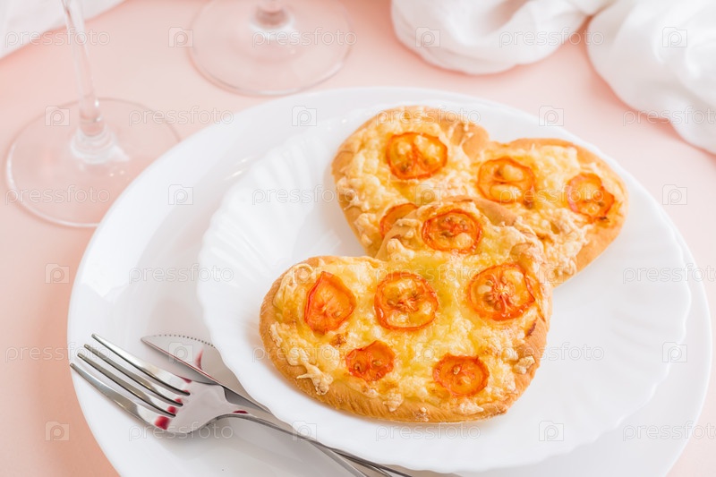 Две свежие пиццы в форме сердца на тарелках на розовом фоне. День Святого Валентина. Крупный план
