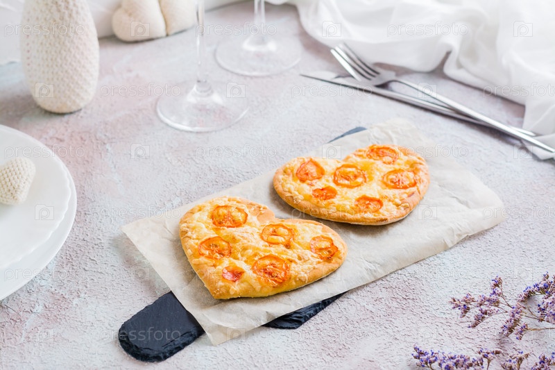 Две готовые к употреблению пиццы в форме сердца на бумаге на столе для празднования дня святого валентина. Крупный план