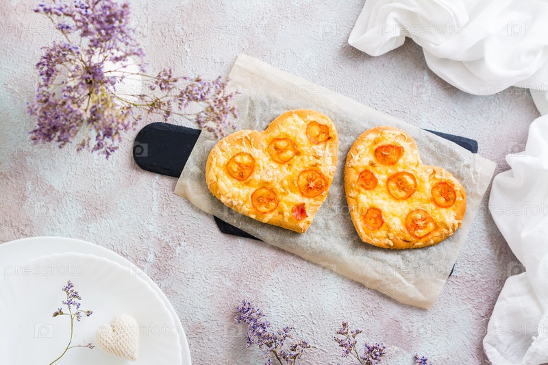 Две пиццы в форме сердца на бумаге на столе для празднования дня святого валентина. Вид сверху