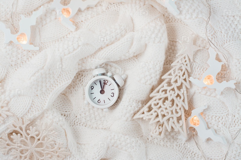 Обратный отсчет в рождественскую ночь. Будильник, елка и свеча на вязаном свитере. Белые цвета. Вид сверху. Копировать пространство